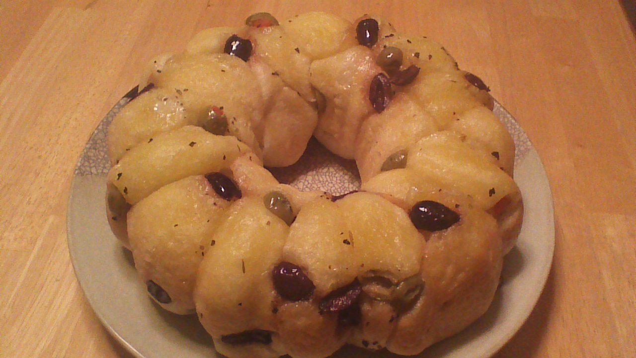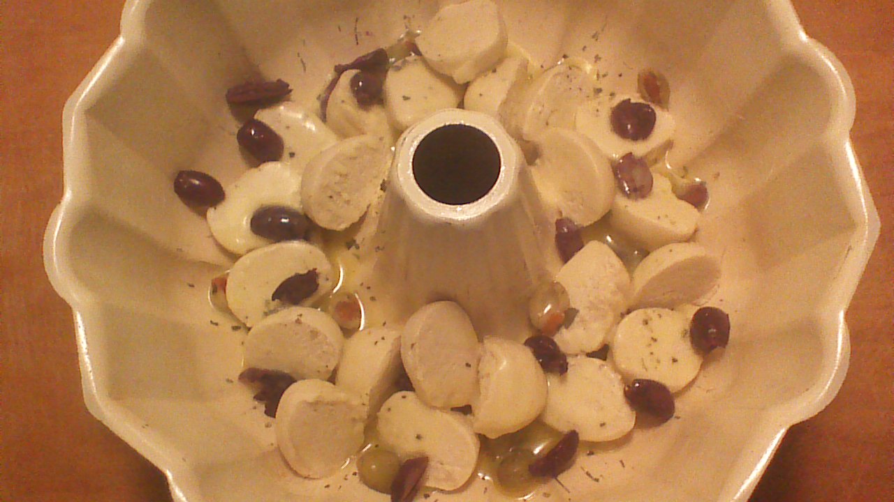 Step 1) Grease Bundt pan well with butter. Layer bread dough, olives, and Italian seasoning blend in pan. Drizzle melted butter over all other ingredients.