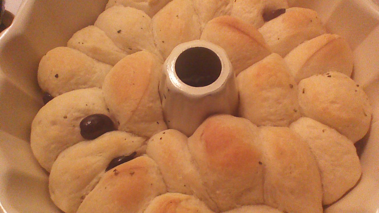 If you have a Bundt pan, you can make a fancy looking ring of pull-apart rolls without any more effort than plain old regular rolls (have I mentioned that I love my Bundt pan?). I like to add olives, but feel free to be creative… a few tablespoons of sliced, sun dried tomatoes and perhaps a sprinkle of freshly grated parmesan cheese would work just as well.