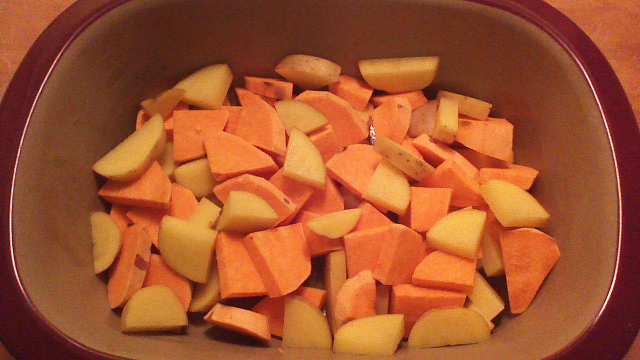 Step 2) Grease a large casserole dish. Line the bottom with potatoes and yams.