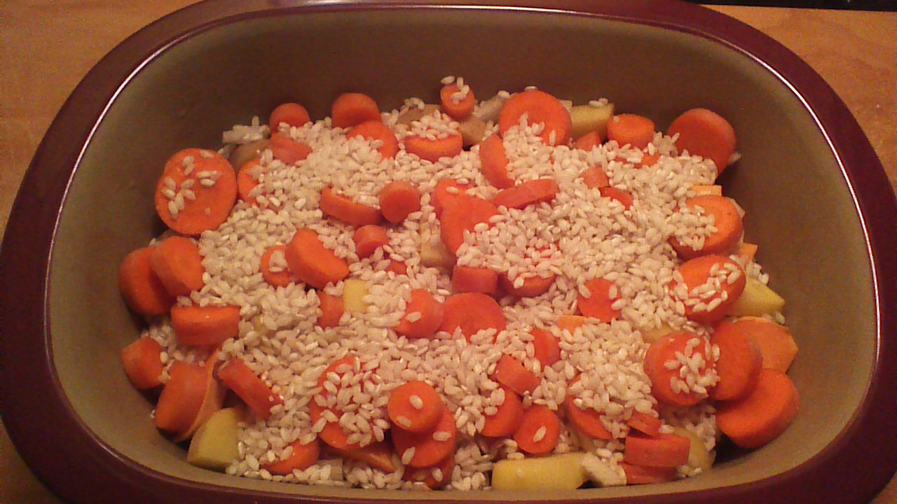 Step 3) Over the potatoes and yams, layer (in order) onions, carrots, raw rice, browned ground beef, salsa, and celery.