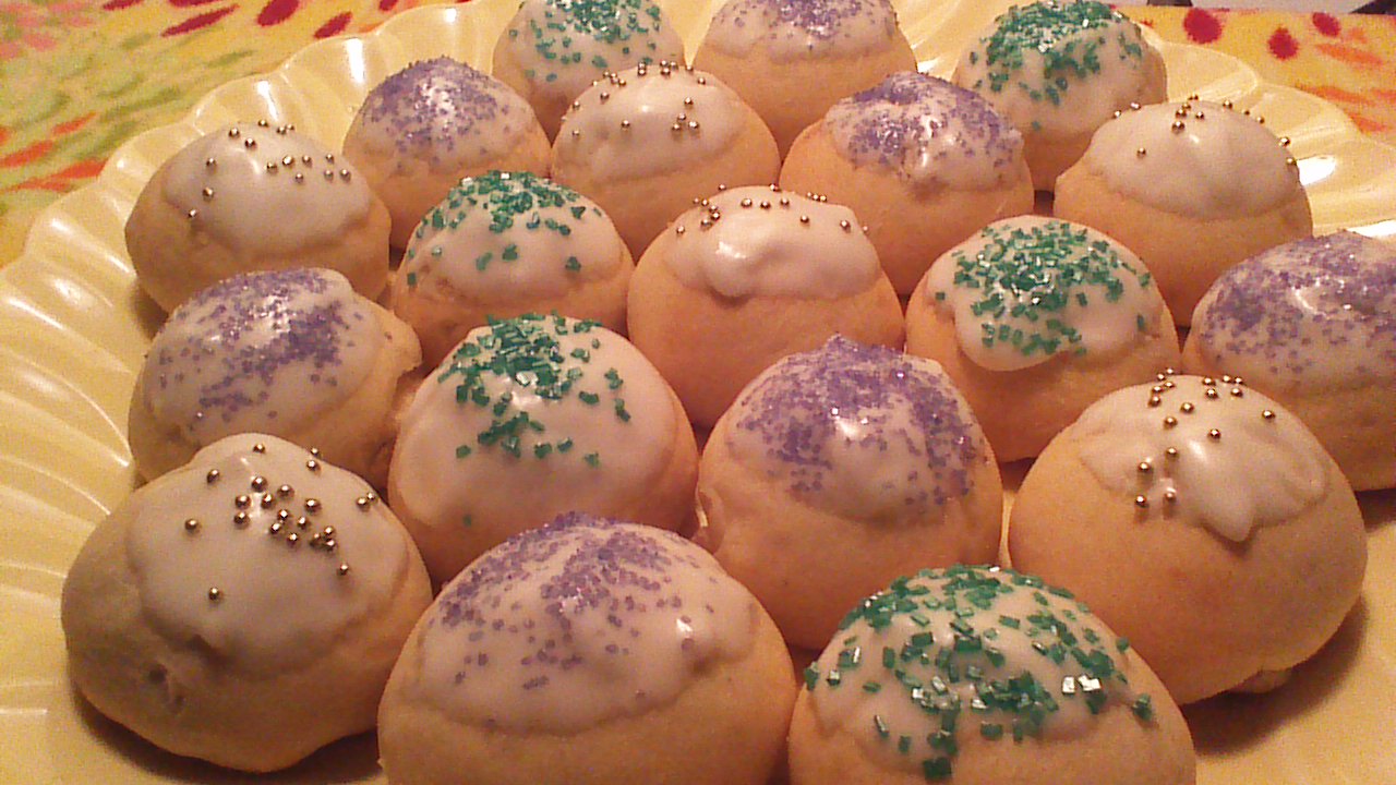 Mardi Gras is “the last hurrah” – the last opportunity to participate in revelry, including the joyful consumption of rich and fatty foods – before settling into an extended period of austerity.  This recipe is perfect for Mardi Gras, being laden with butter, eggs, and sugar.  These Lemon Sweet Rolls are really a cross between a yeast roll and a donut.  I used my German Great-Grandmother’s stollen recipe as a base for the dough, adding candied lemon, a boozy lemon icing, and decorations appropriate for this festive day. Enjoy!