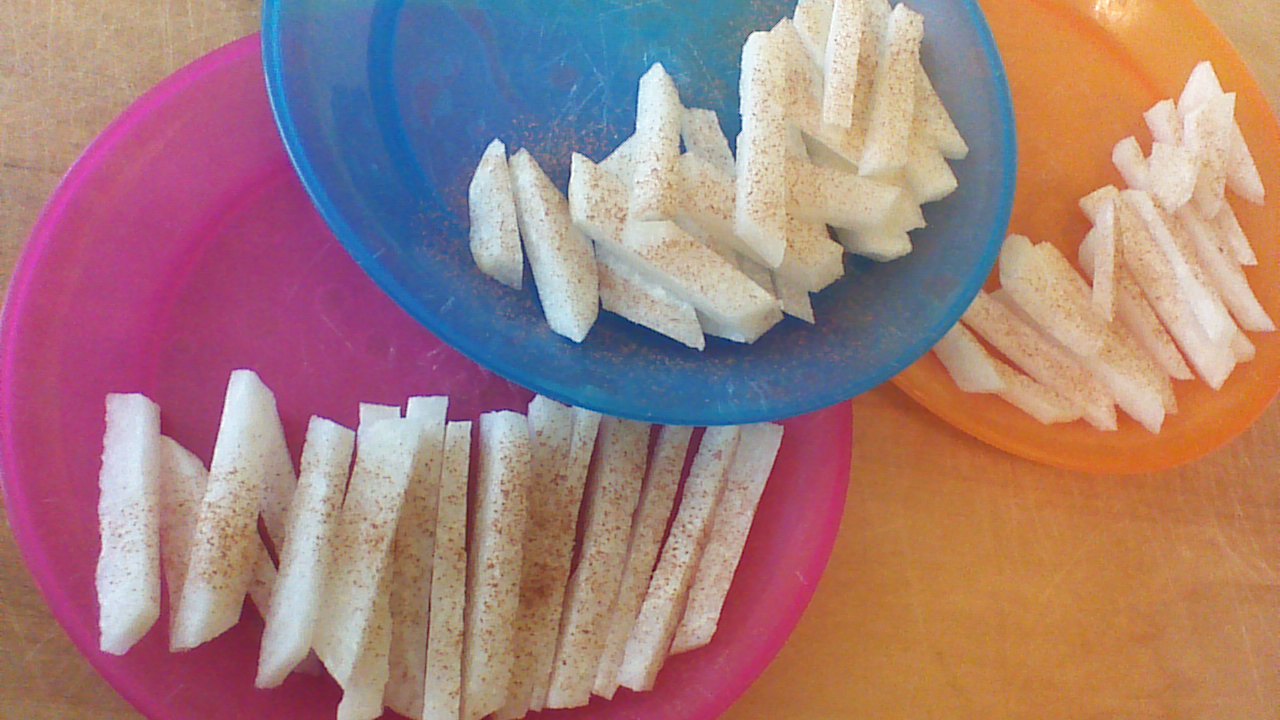 Simply cut a jicama in half, trim off the peel, and slice into French fry size sticks. Sprinkle with cinnamon (not sugar, just cinnamon) and enjoy. Sometimes, healthy eating really is this simple!