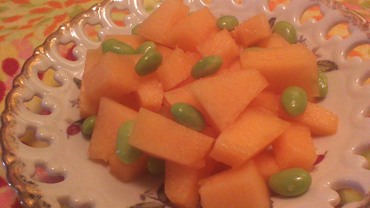 For two servings, simply toss together 2 cups of freshly diced cantaloupe and 1 cup of precooked, shelled edamame (readily available in the frozen vegetable section of most supermarkets). Sprinkle with a dash of sea salt. That’s all!