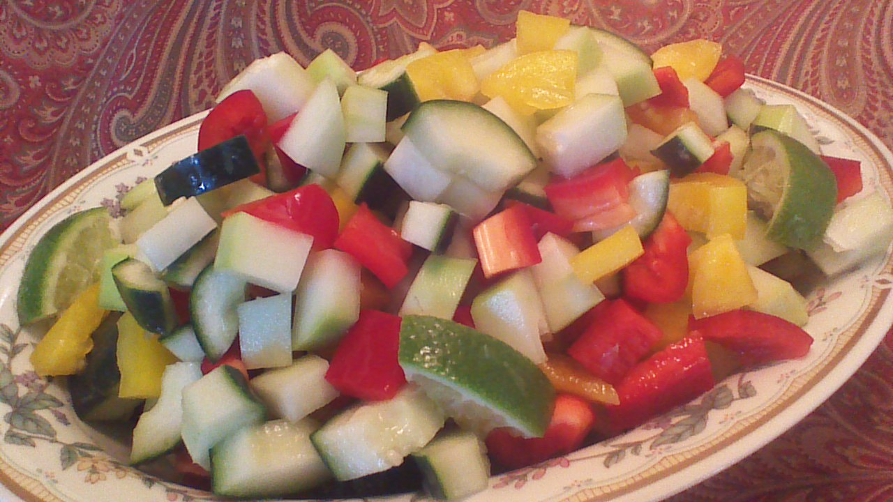 Step 3) Drizzle dressing over the diced vegetables and toss lightly to combine. Garnish with wedges cut from the squeezed lime, and serve.