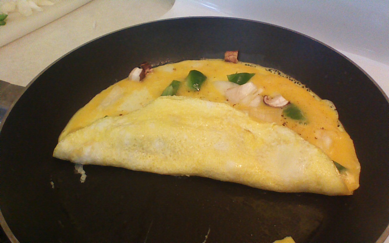 Step 4) Use a flexible spatula to fold the omelette into thirds, so that the veggies and/or meat, as well as the cheese, are hidden inside.