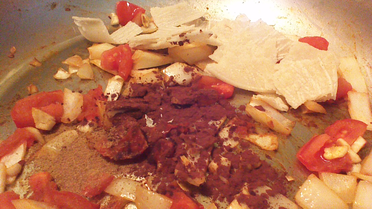 WIN_20150423_162211Step 4) Next, add 1/2 teaspoon cocoa powder, 1/4 teaspoon ground cumin, and 1 small corn tortilla (torn into pieces) to the skillet. Stir everything around over low-medium heat for another 5 minutes.