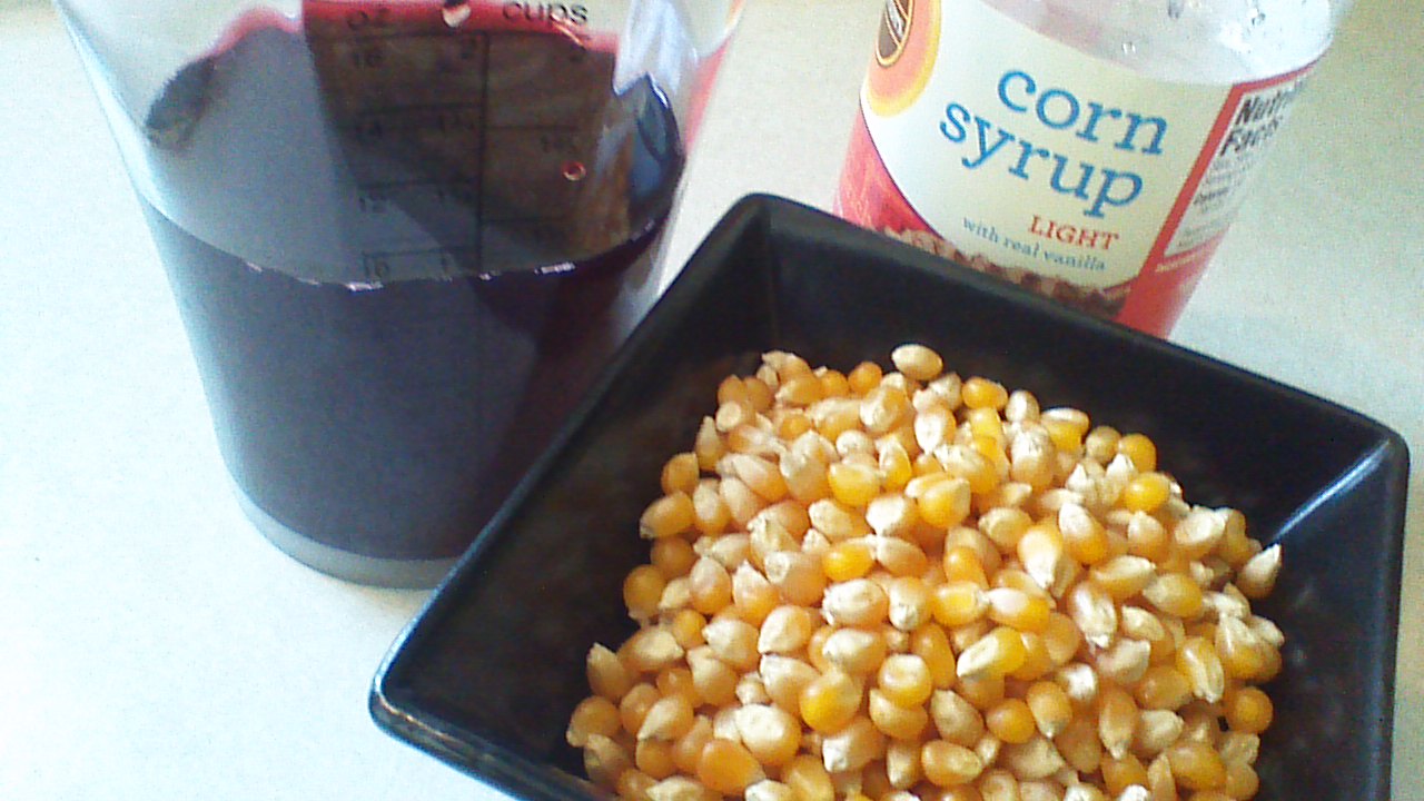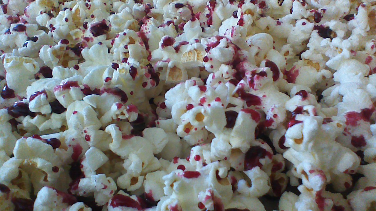 Step 3) Drizzle cherry syrup over popcorn and place popcorn in a preheated 250 degree oven. Bake for 5 minutes.