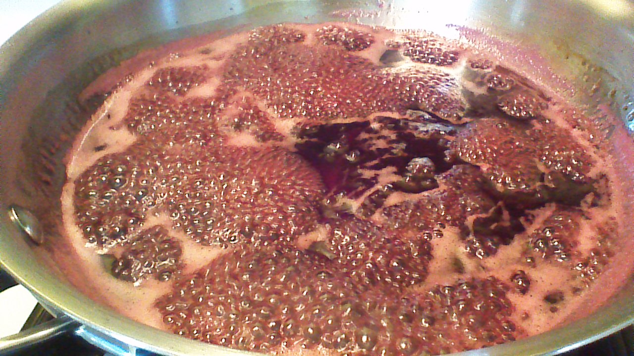 Step 2) Bring 1 cup of cherry juice and 1/2 cup of light corn syrup to a boil in a medium saucepan. Boil for 10 minutes, until reduced to one-third of its original volume. Remove from heat.