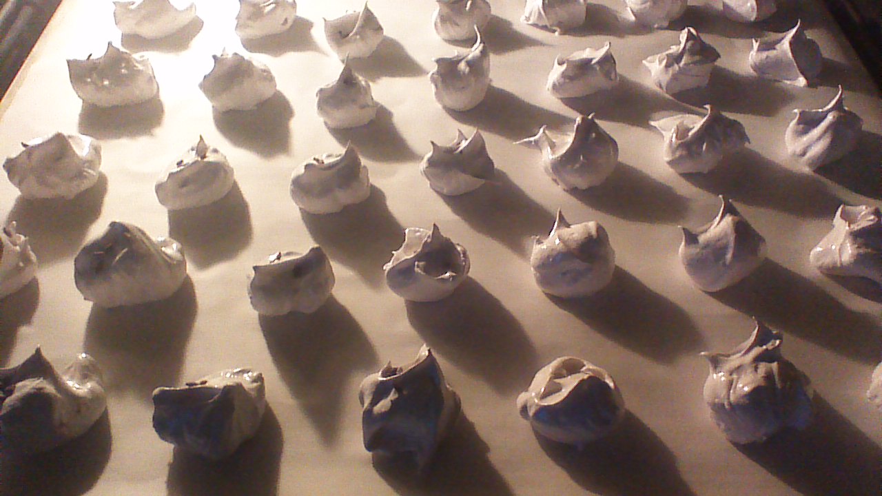 Step 3) Drop tablespoonsful of the meringue mixture onto a greased cookie sheet, leaving 1 – 2 inches between meringues. Bake in a preheated 300 degree oven for 20 minutes.
