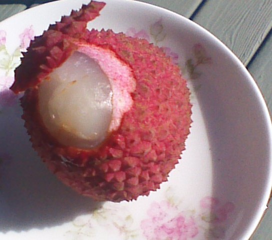 My local Asian market has always stocked dozens of varieties of canned lychee products, and additional dozens of lychee flavored products (tapioca desserts, for example). Today, however, was the first time I noticed FRESH lychee fruit in the produce section. The price, about $4 per pound, seemed kind of steep at a glance. However, lychee fruit are pretty small – smaller than a plum – and I was able to purchase enough for a pretty little dish for about $2.