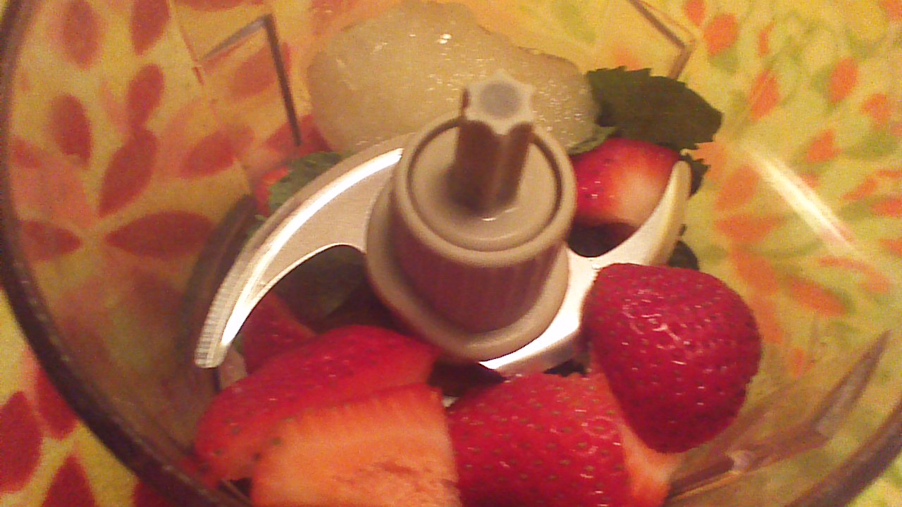 Step 1) Pulse strawberries, mint, rum, and limeade concentrate in a small food processor or blender until well blended.