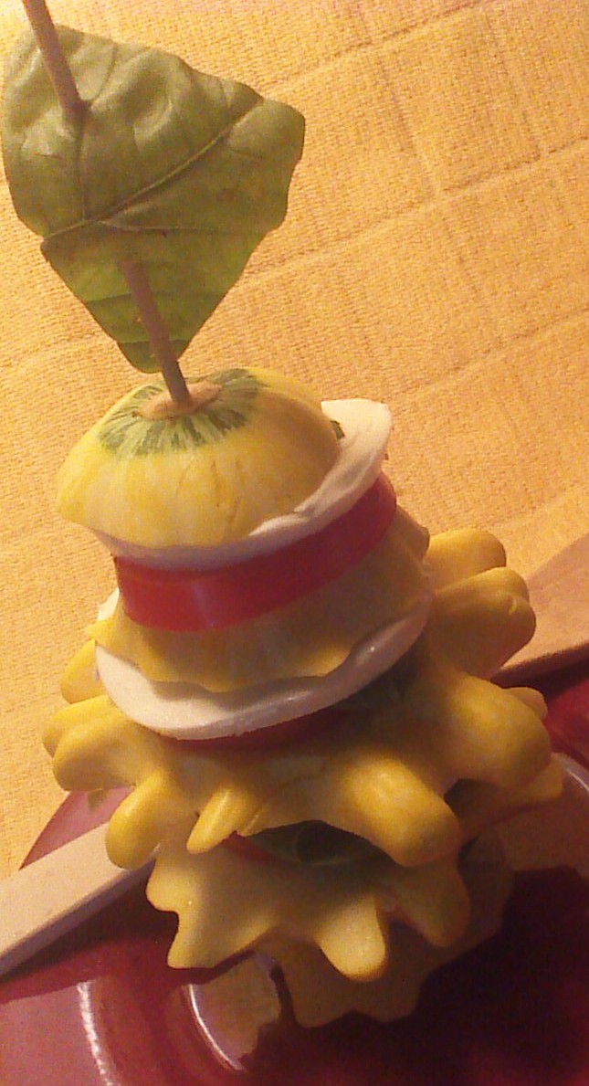 Place the first slice of patty pan squash on a plate, and push the flat end of a skewer into the squash. This will serve as your base. Slowly lower slices of tomato, basil, and mozzarella over the pointed end of the skewer and down to the base. Repeat layers until you have used the entire patty pan squash. Top with a triangle “flag” cut from a basil leaf. Serve immediately with balsamic vinegar and olive oil.