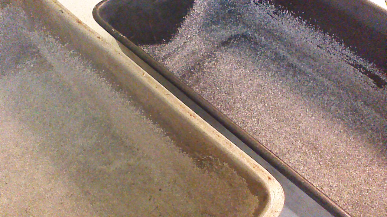Step 1) Grease two bread pans and “flour” using granulated sugar. This adds a
