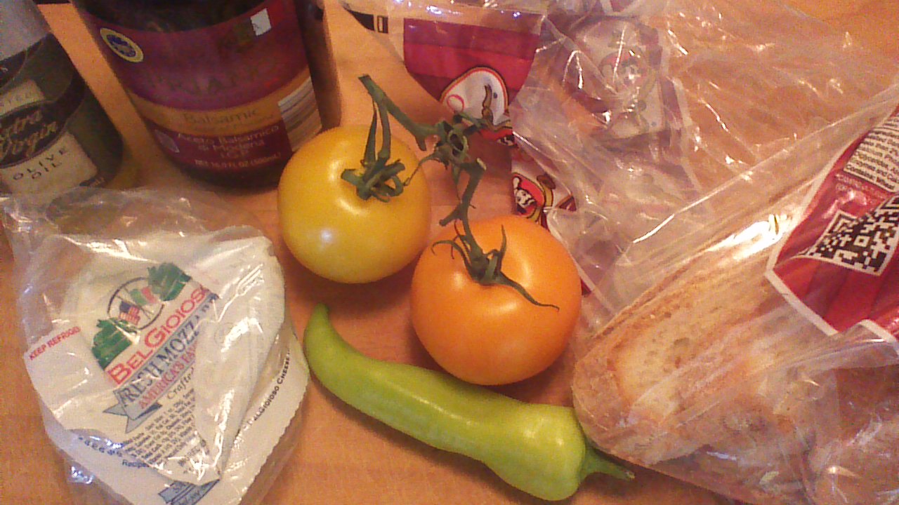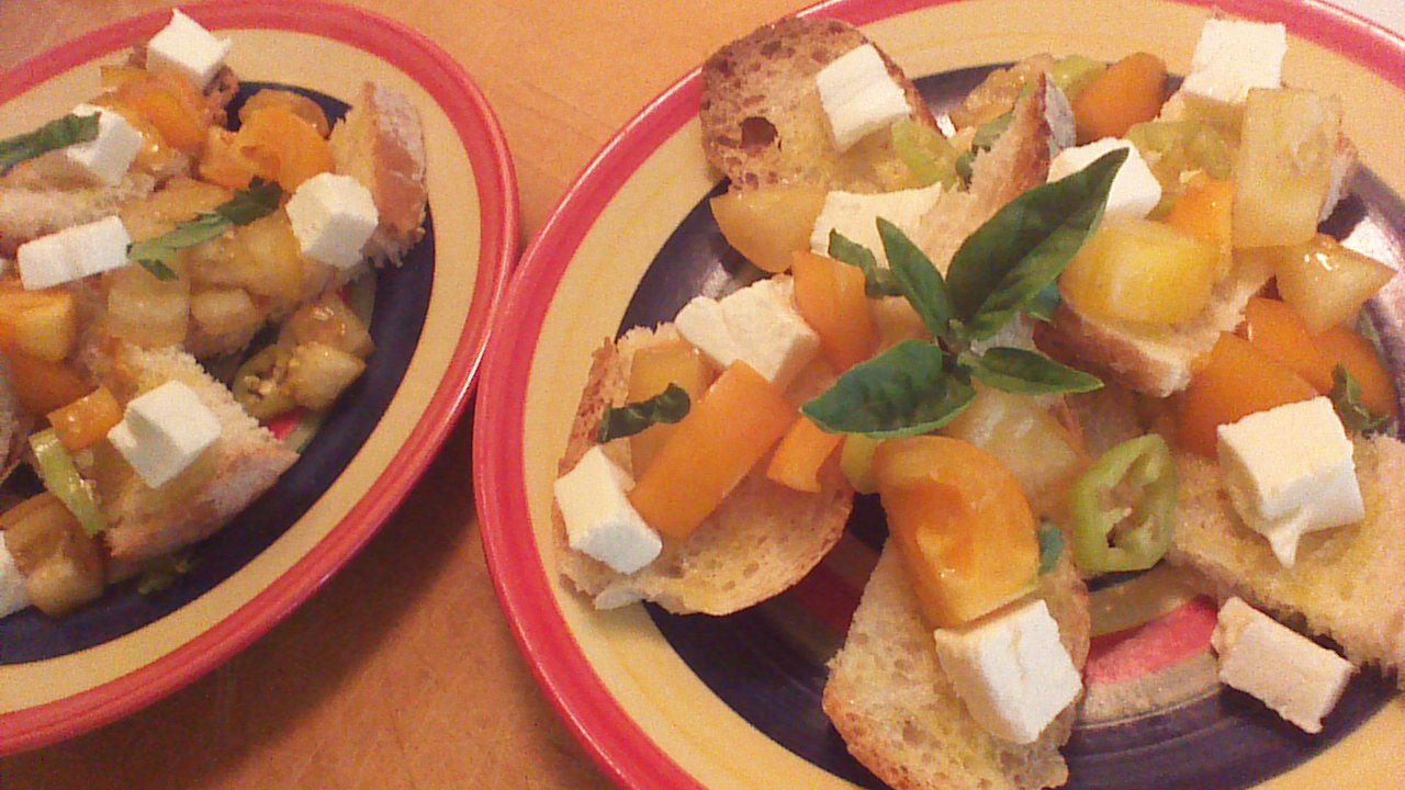 Today’s recipe isn’t rocket science, folks – bruschetta is peasant food. Like most peasant food, making bruschetta is a way of taking little bits and specks of leftovers and reimagining them into something delicious! You’ll need small quantities of fresh vegetables, a few slices of not-very-fresh bread, and a bit of cheese. Surely you have all of that lurking in your kitchen, right?