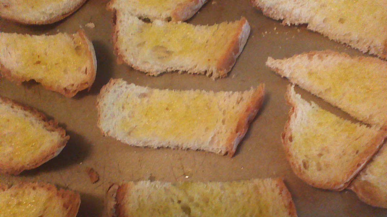 Step 2) Cut bread slices into 2 inch strips and place on a baking sheet. Using a pastry brush, coat top sides of bread strips with olive oil. Sprinkle with sea salt if desired (optional). Broil on a low setting for about 3 minutes. Watch carefully – bread should be toasted but not burned!