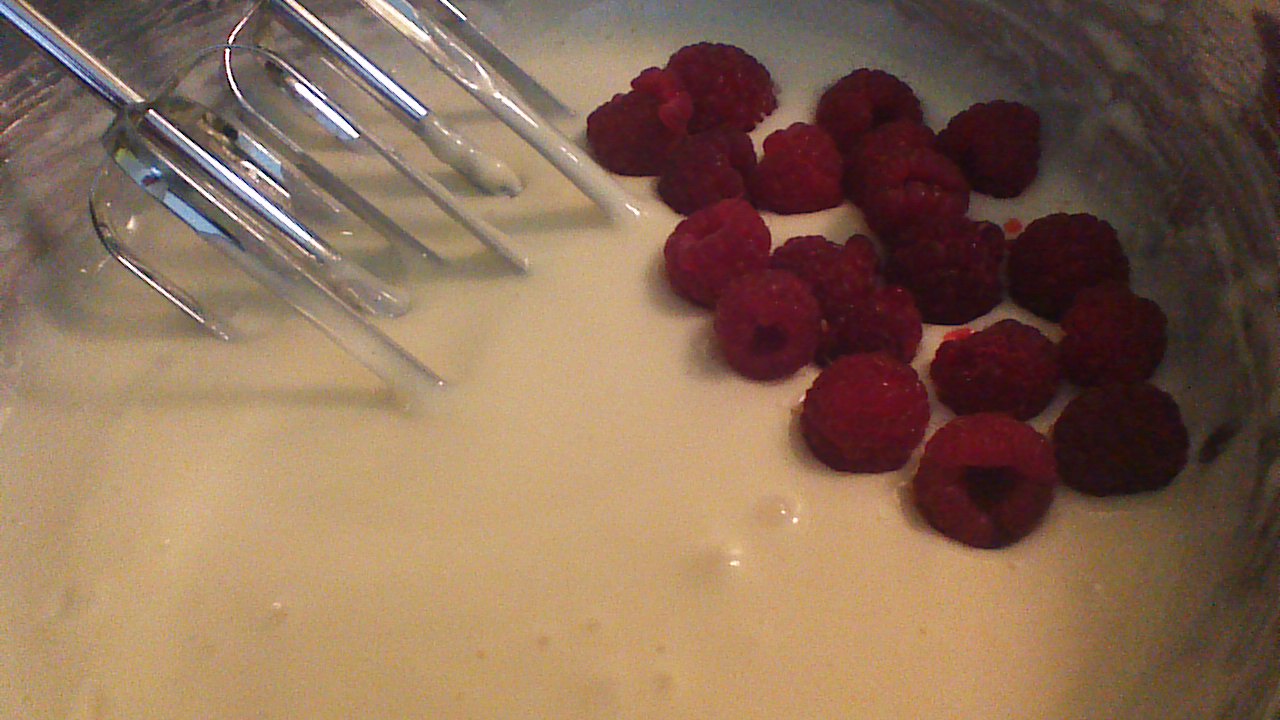 Step 2) Add 1/4 cup raspberries and blend with the electric mixer on low for about 30 seconds. The raspberries will quickly fall apart and combine nicely with the pie filling.
