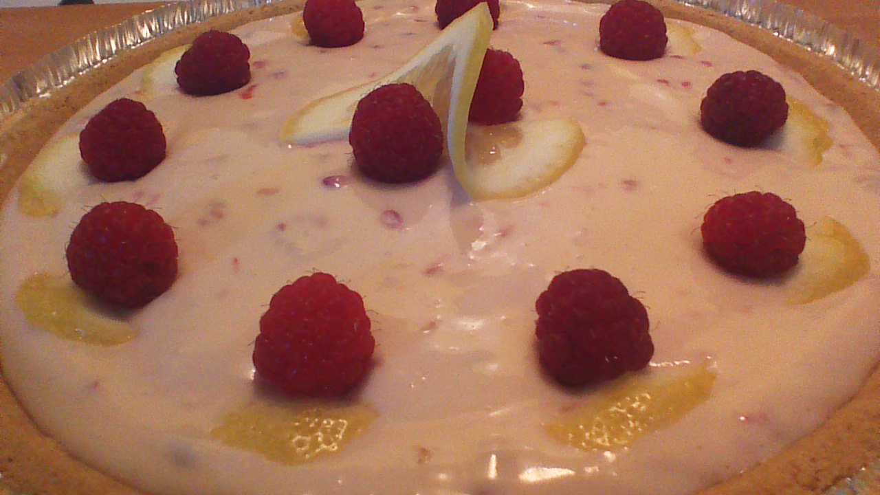 Step 3) Pour pie filling into the graham cracker crust. Smooth the top with a rubber scraper. Garnish with whole raspberries and lemon slices.
