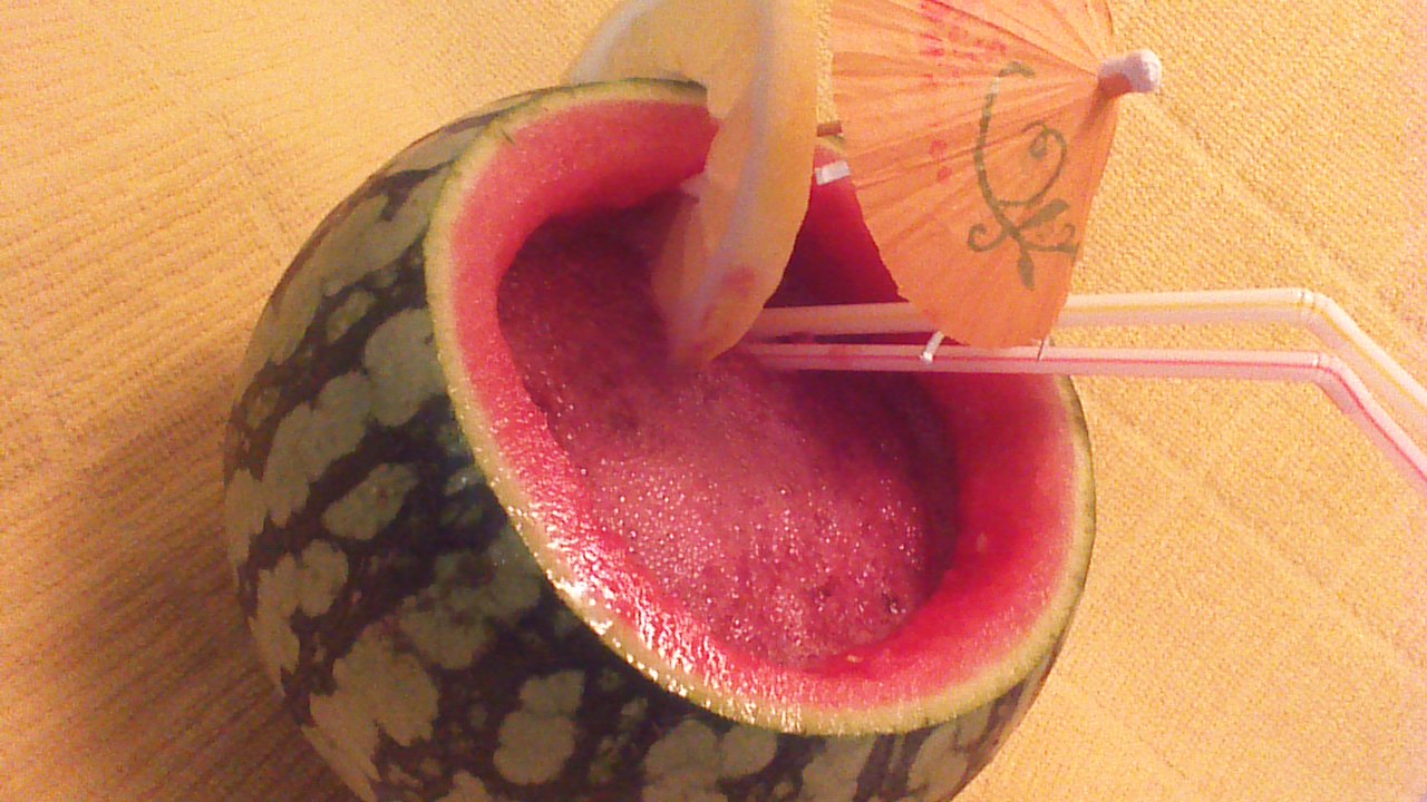 Step 1) Set watermelons on a countertop to see how they naturally balance. Cut a thin slice off of the top (parallel to the countertop) of each watermelon. Carefully scoop out the insides, placing the watermelon flesh in a blender. DON’T GET CARRIED AWAY – if you accidentally puncture the watermelon rind, you can’t use the rind as a serving cup!