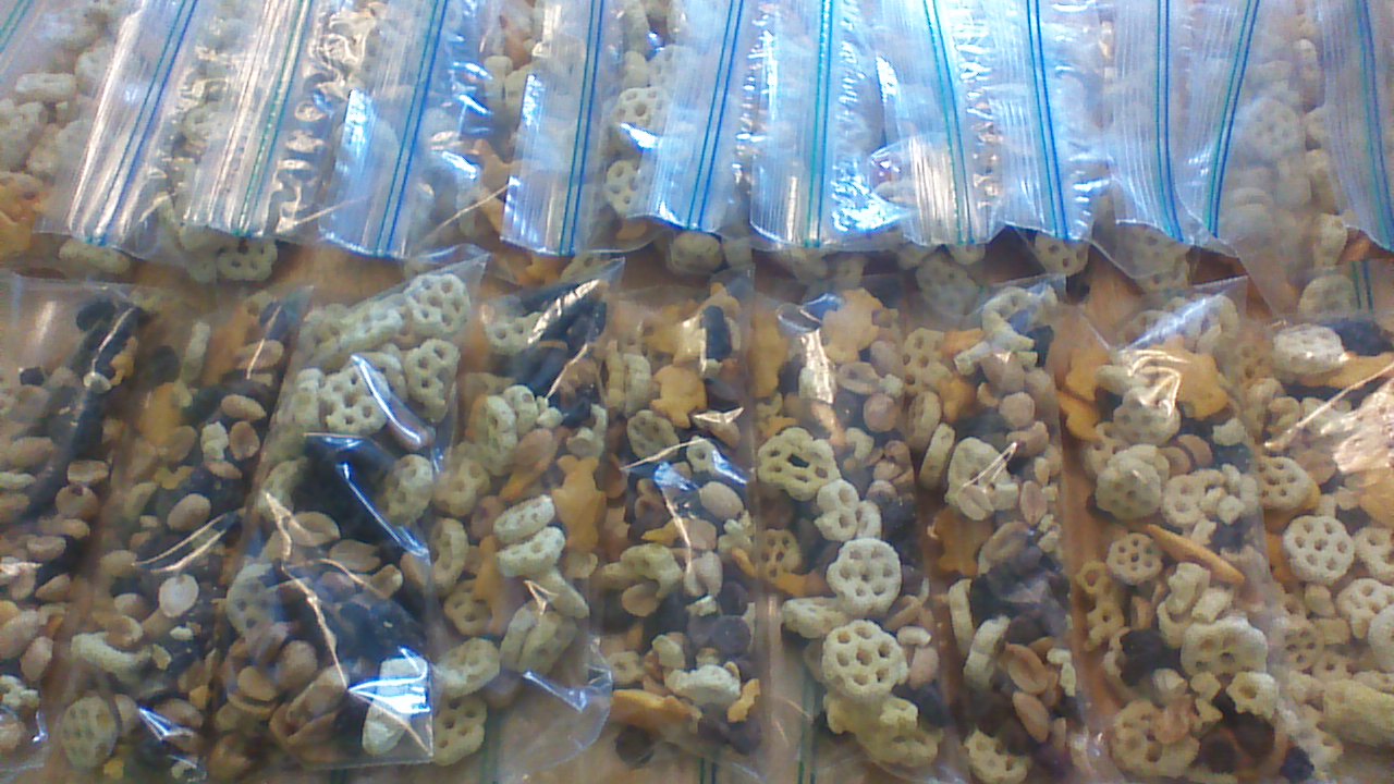 Simply mix ingredients together in a large bowl, and ask your mini-chefs to fill snack size bags! Double check that each bag is sealed, and store in a large container (a shoebox works well).