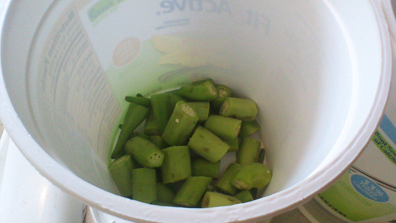 Step 4) Divide the cooked chicken into fourths and place in each freezer container on top of the sausage. Likewise, divide okra and any other raw vegetables you are using between the four freezer containers. The containers should appear full.
