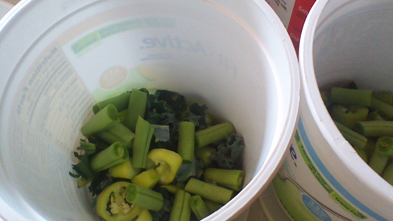 Step 1) Fry sausage in a large, heavy pan until it is cooked through – don’t wash the pan afterward! Remove sausage from pan and cut into small pieces. Divide the pieces between 4, quart size freezer containers (we