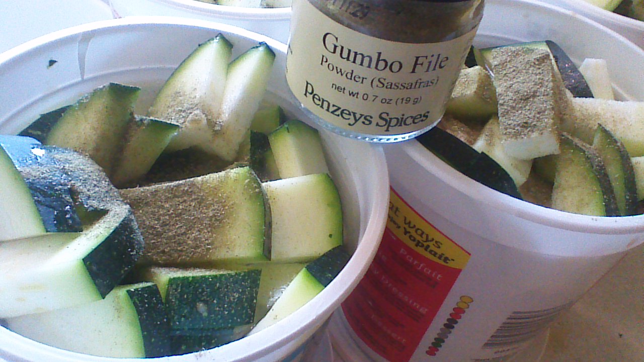 Step 5) Sprinkle one teaspoon of gumbo file (fee-lay) powder into each freezer container. Gumbo file powder is made from dried sassafras leaves, and is considered by many to be an “essential” ingredient in creole dishes such as gumbo. In addition to flavoring your gumbo, file powder acts as a thickening agent.
