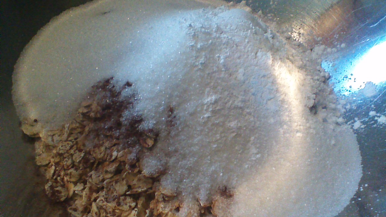 Step 1) Combine flour, oats, cocoa, sugar, baking powder, and salt. Add egg, milk, and oil. Stir until all ingredients are incorporated.