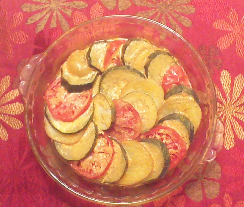 Step 1) Grease a 9″ pie dish with olive oil. Arrange zucchini, potato, and tomato slices as shown (zucchini, potato, zucchini, tomato, repeat).