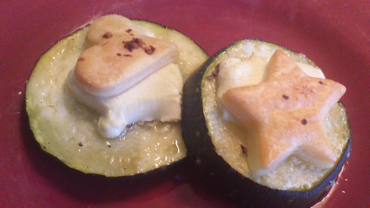 Step 4) Roll out the refrigerated pie crust and cut 16 small (1 – 2 inch diameter) shapes using cookie cutters. Place one shape on each zucchini slice, so that the pastry slightly overlaps the Chèvre.