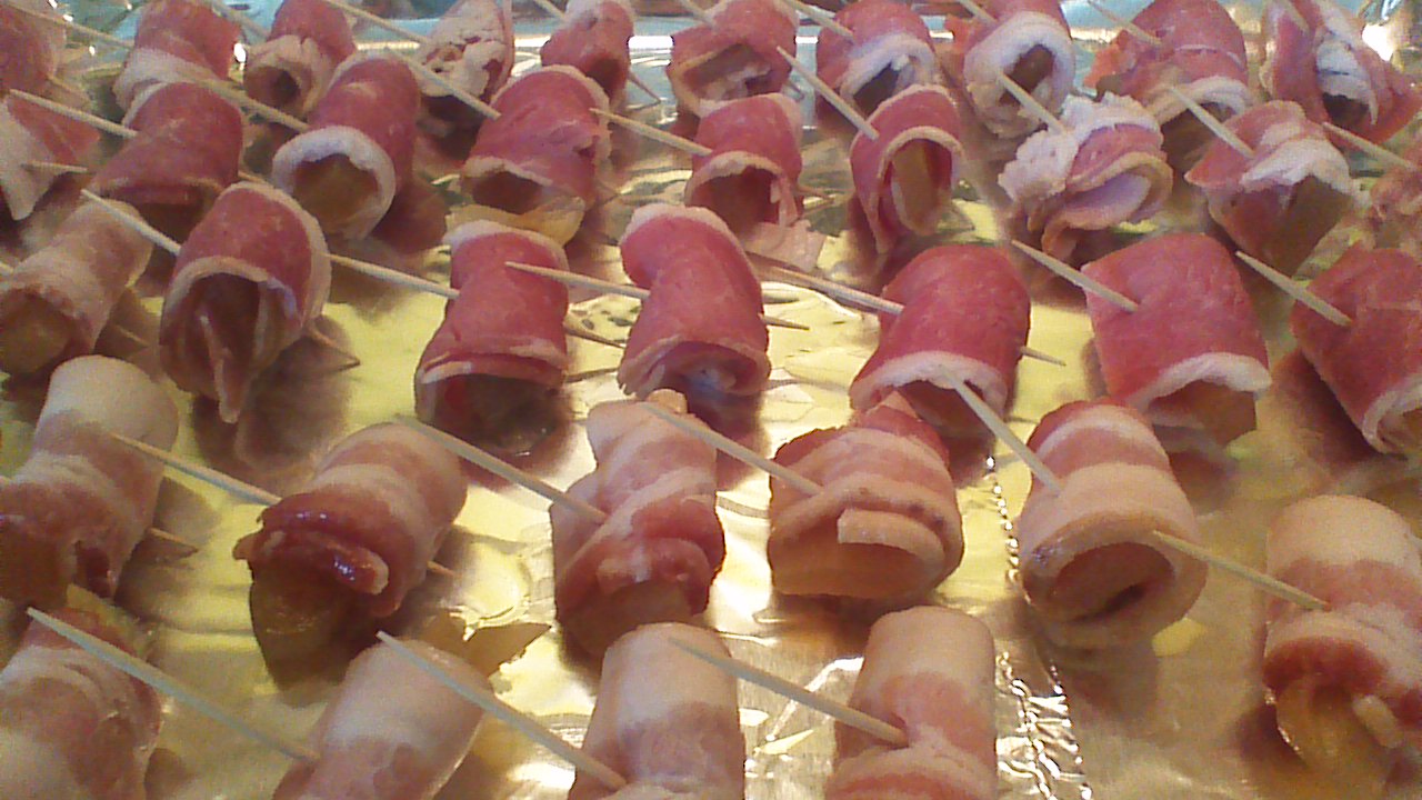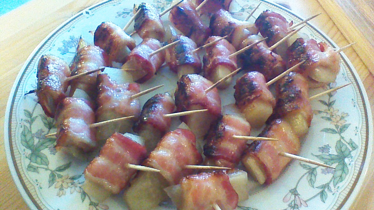 wrapped appetizers is a SNAP. All you need is a jar of pickled watermelon rind, a pound of sliced bacon, and toothpicks.
