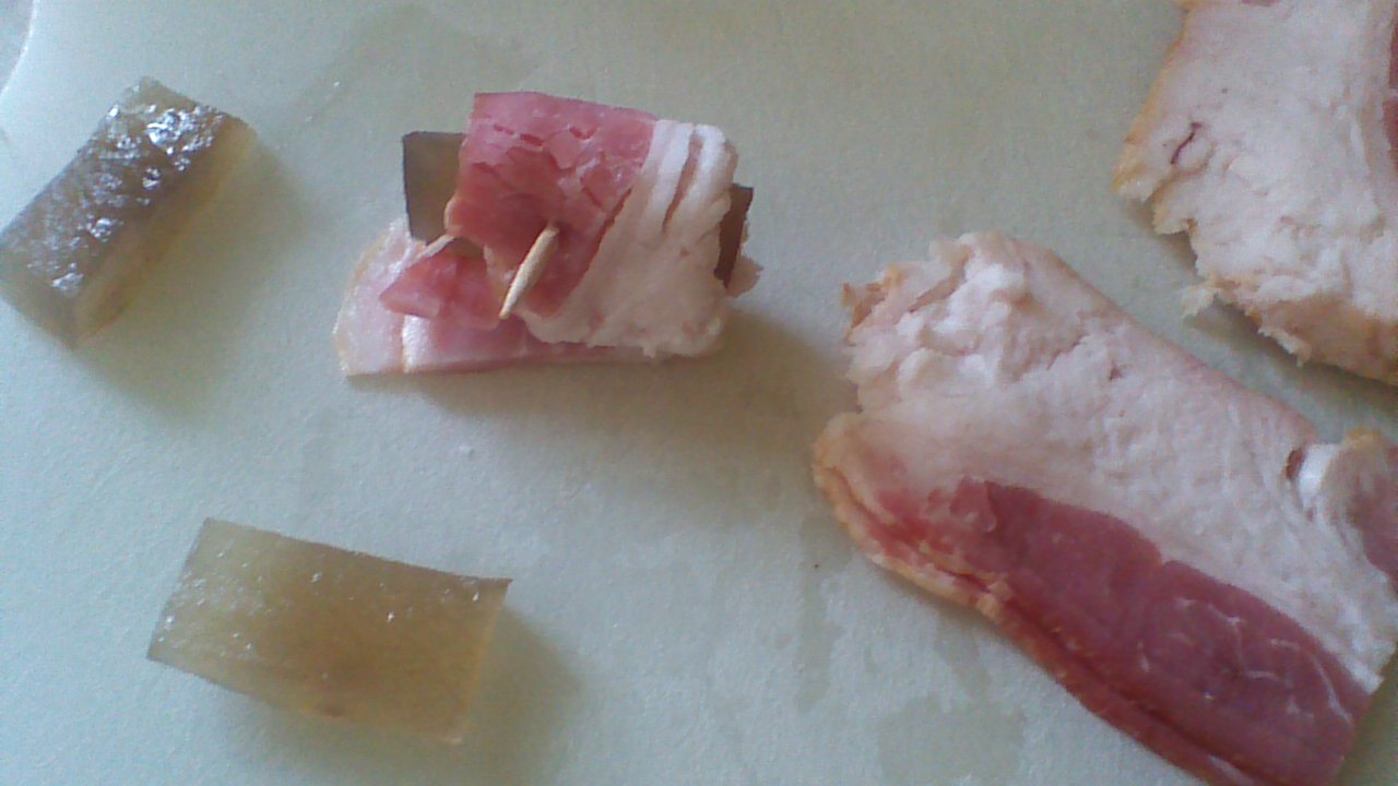 Second, wrap each short bacon strip around a piece of pickled watermelon rind, and