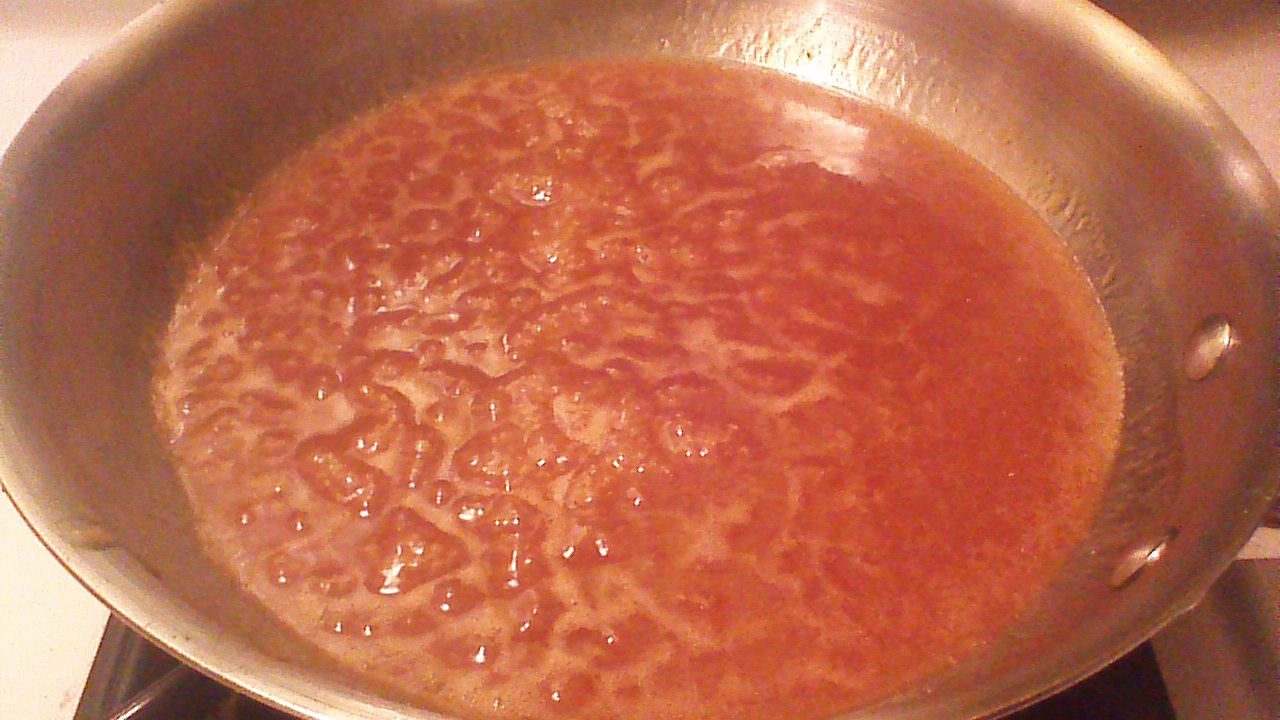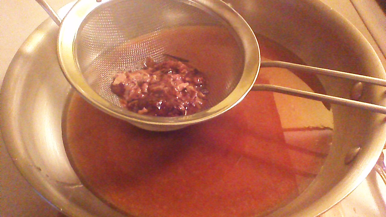 Step 1) After you remove your turkey (or other meat) from your roasting pan, scrape all of those funky looking drippings into a sieve placed over a saucepan (see photo). Discard the solids in the sieve.