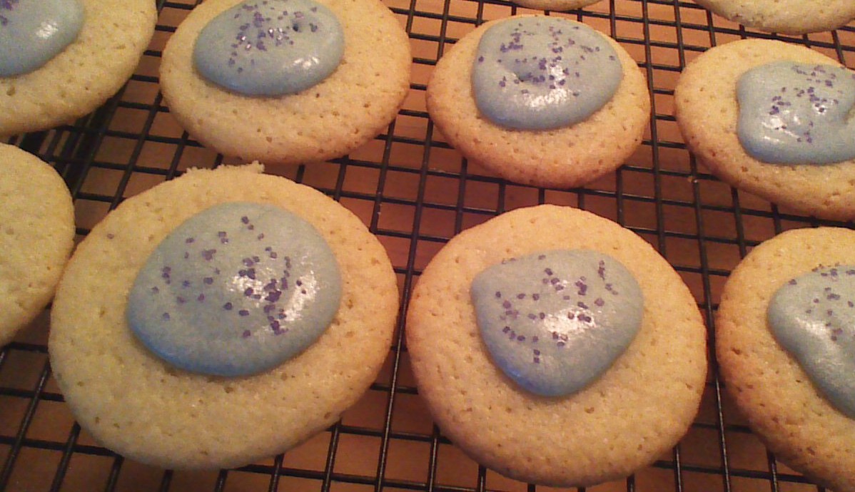 Step 6) While cookies cool, blend together butter, powdered sugar, rum, and food coloring for icing. Pipe icing onto the center of each cooled cookie, right over the gumdrop (a sandwich bag with a corner snipped off works well as a homemade pastry bag). Sprinkle with colored sugar, and Voila! Your Hidden Gumdrop Cookies are ready to enjoy!