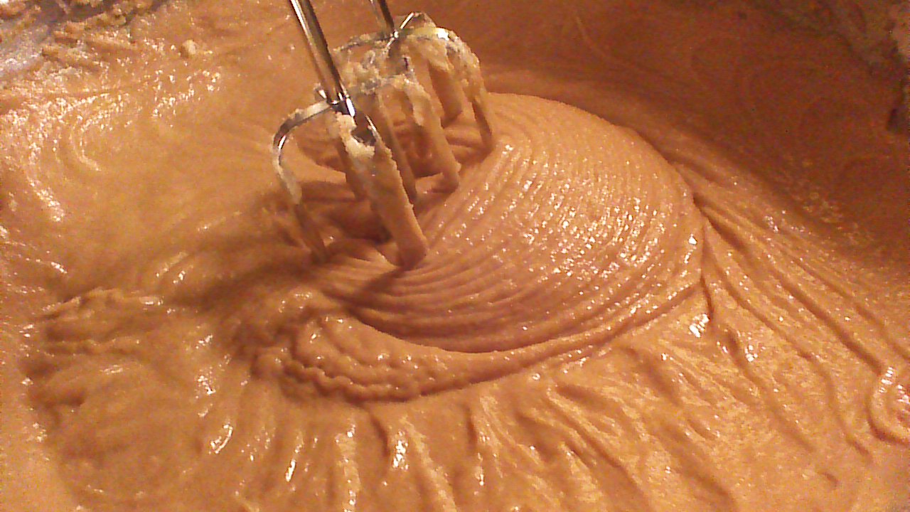 Step 1) Using an electric mixer, cream together peanut butter, butter, and sugars. Add eggs and almond extract. Blend well.