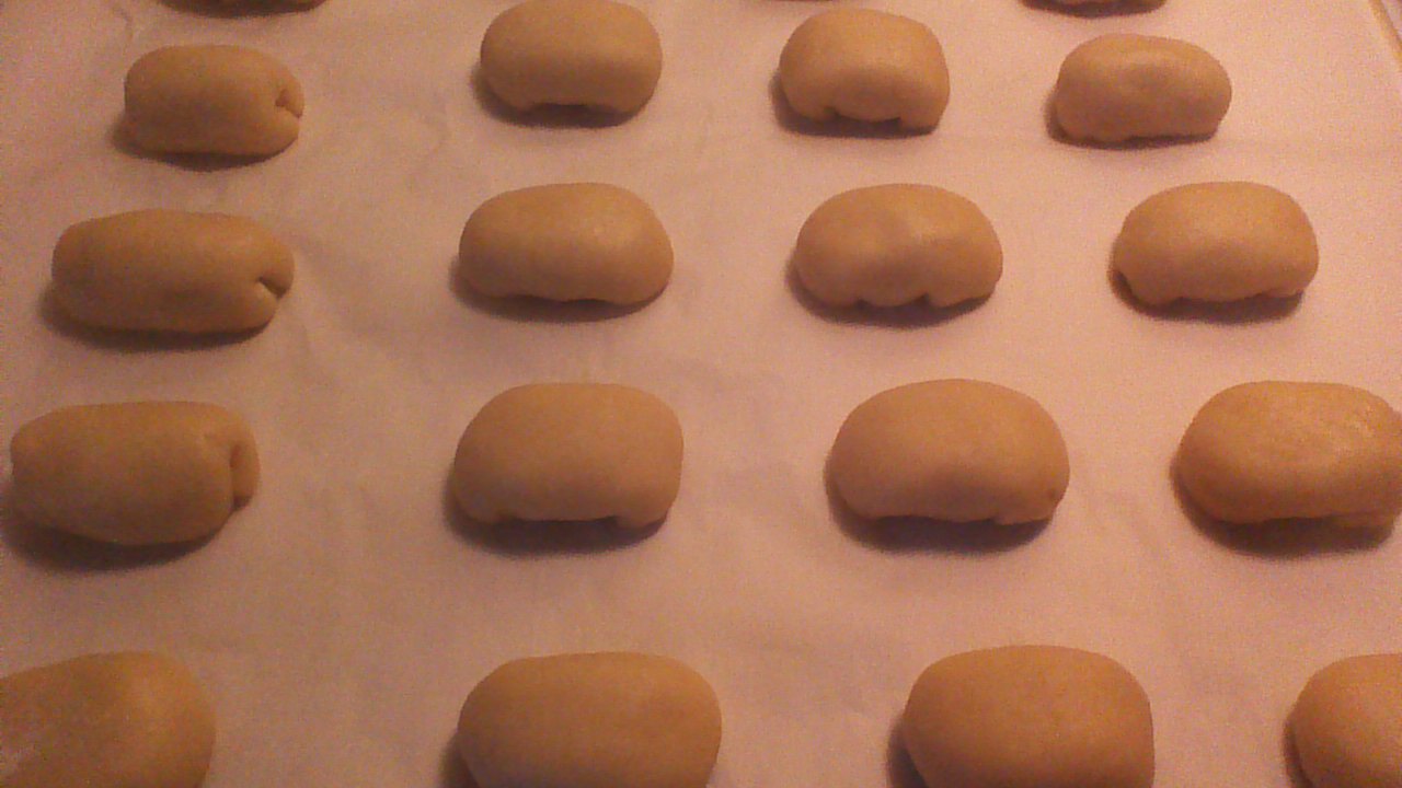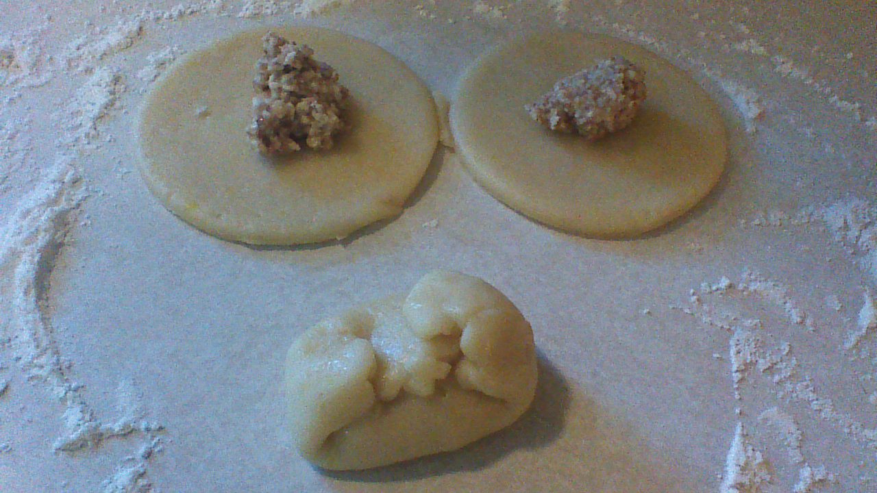 Step 6) Place ½ teaspoon of nut filling from Step 4 in the center of each circle of dough. Fold the edges of dough together and gently press to seal; filled dough should take the shape of small eggs.