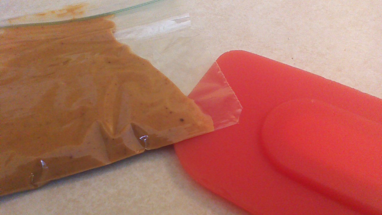 Step 8) Spoon peanut butter into a snack size bag and snip off one corner of the bag as shown above. Use this homemade pastry bag to draw a design with peanut butter onto your chocolate cake batter.