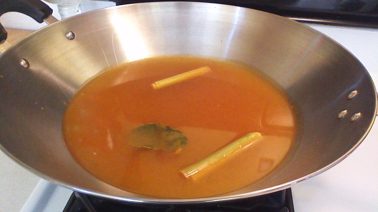 Step 1) Combine lemongrass, lime leaf, tom yum paste, ginger, and water in a wok or large pot. Bring to a boil.
