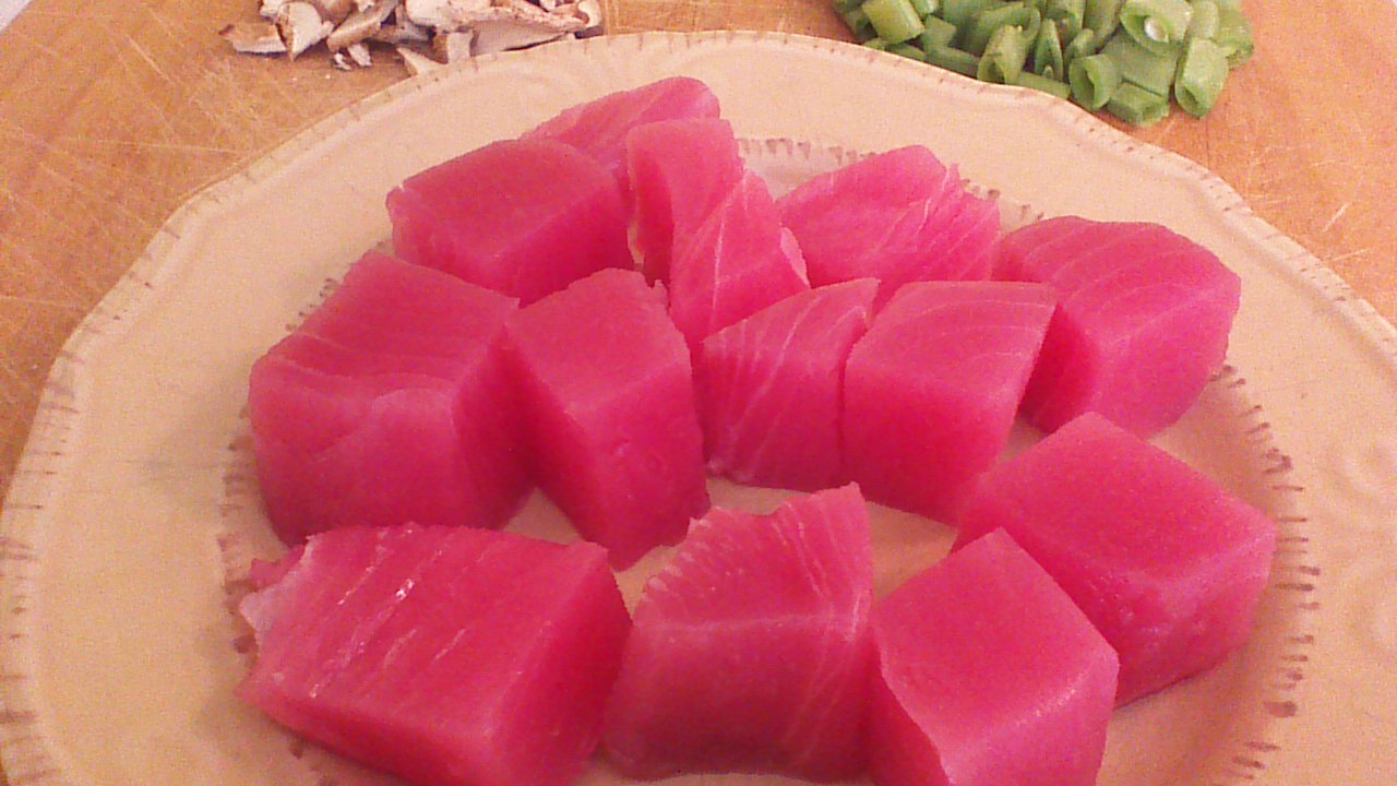 Step 3) Add tuna pieces and simmer for 5 minutes or until tuna is just barely pink in the center.