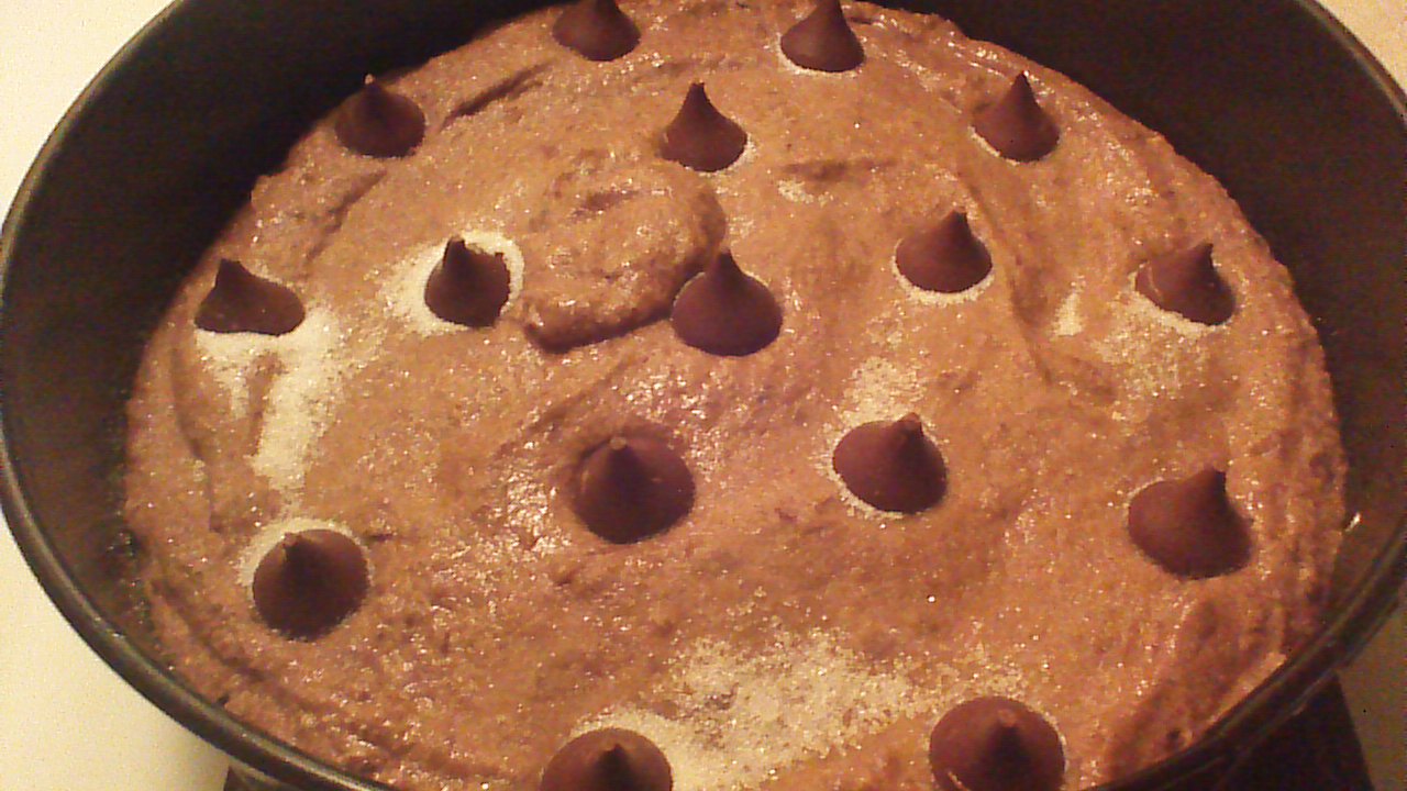 WIN_20160108_210238Step 5) Arrange the Hershey’s Kisses evenly on the top of the cake. Don’t press down; just set them lightly on top. [As the cake bakes, the Hershey’s Kisses will sink into the middle of the cake.] Sprinkle the top of the cake with 1 tablespoon of sugar.