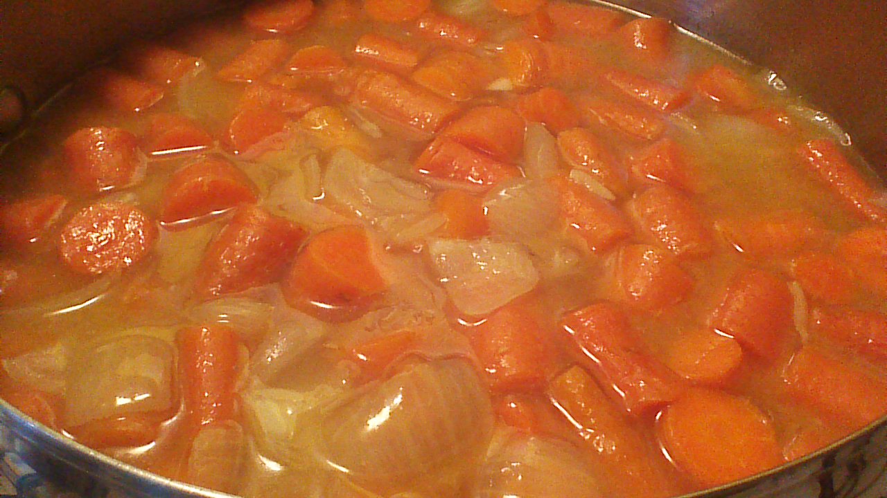Step 1) Bring stock, garlic, onion, and carrots to a boil in a large pot. Reduce heat and cover. Simmer gently until carrots are very soft, approximately 30 minutes.