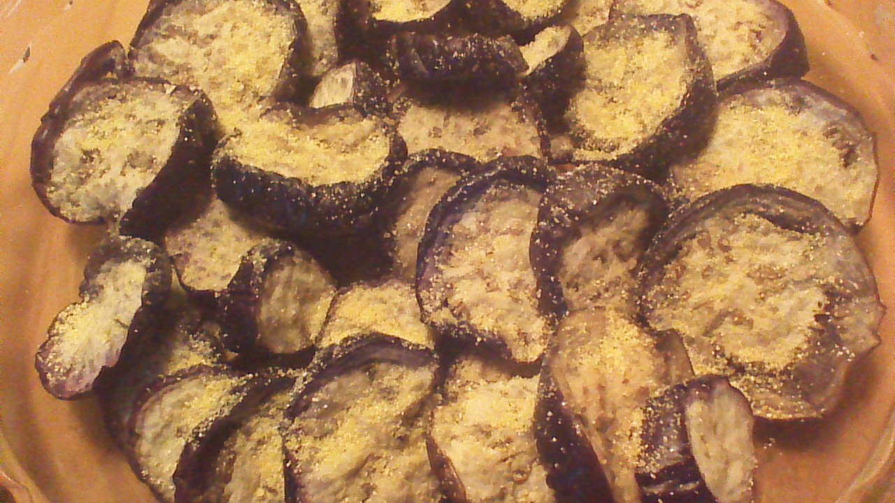 Step 2) Arrange eggplant in a pie dish or casserole dish. Sprinkle evenly with cornmeal, black pepper, salt, and rosemary.