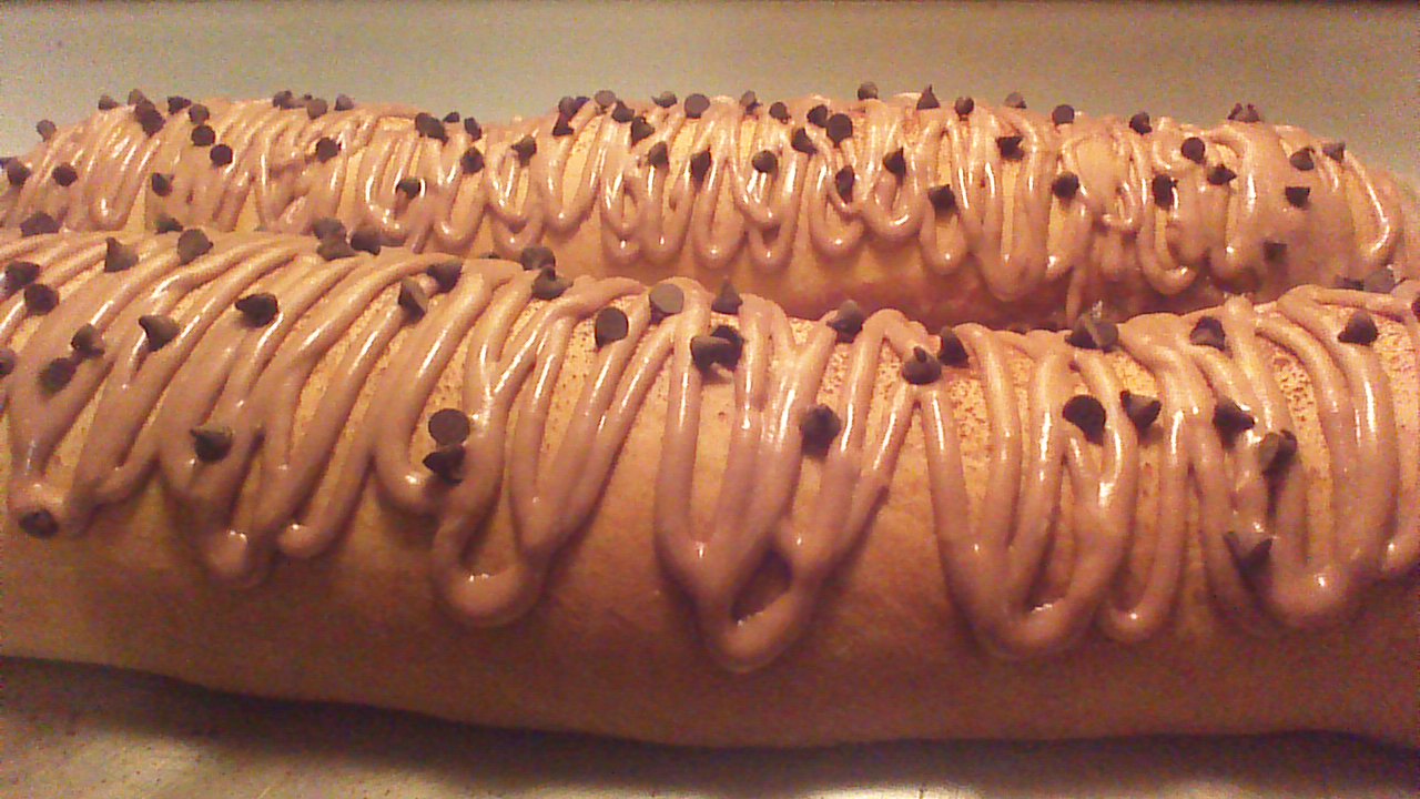Step 6) Blend together 12 ounces of cream cheese, 2 teaspoons vanilla extract, 1 cup of sugar, and 2 tablespoons cocoa powder. Spread this mixture down the centers of each rectangle, and sprinkle with 1/2 cup of mini chocolate chips. Fold the rectangles in thirds, to make long, skinny loaves with the filling trapped inside (see photo, above).