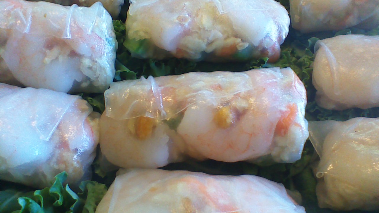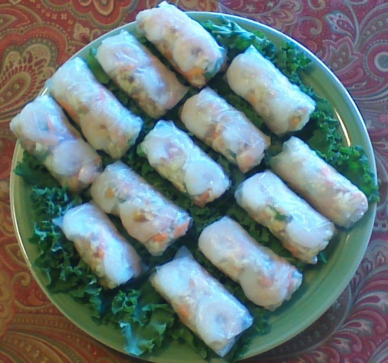 Spring rolls are a FRESH food and are best enjoyed within a few hours of rolling (store in the refrigerator if not enjoying immediately). Try dipping your spring rolls in soy sauce, plum sauce, or peanut satay sauce – delicious! Spring rolls are inherently low in fat and are gluten free. You could also omit the shrimp and add some shredded greens for your vegan friends. Have fun!
