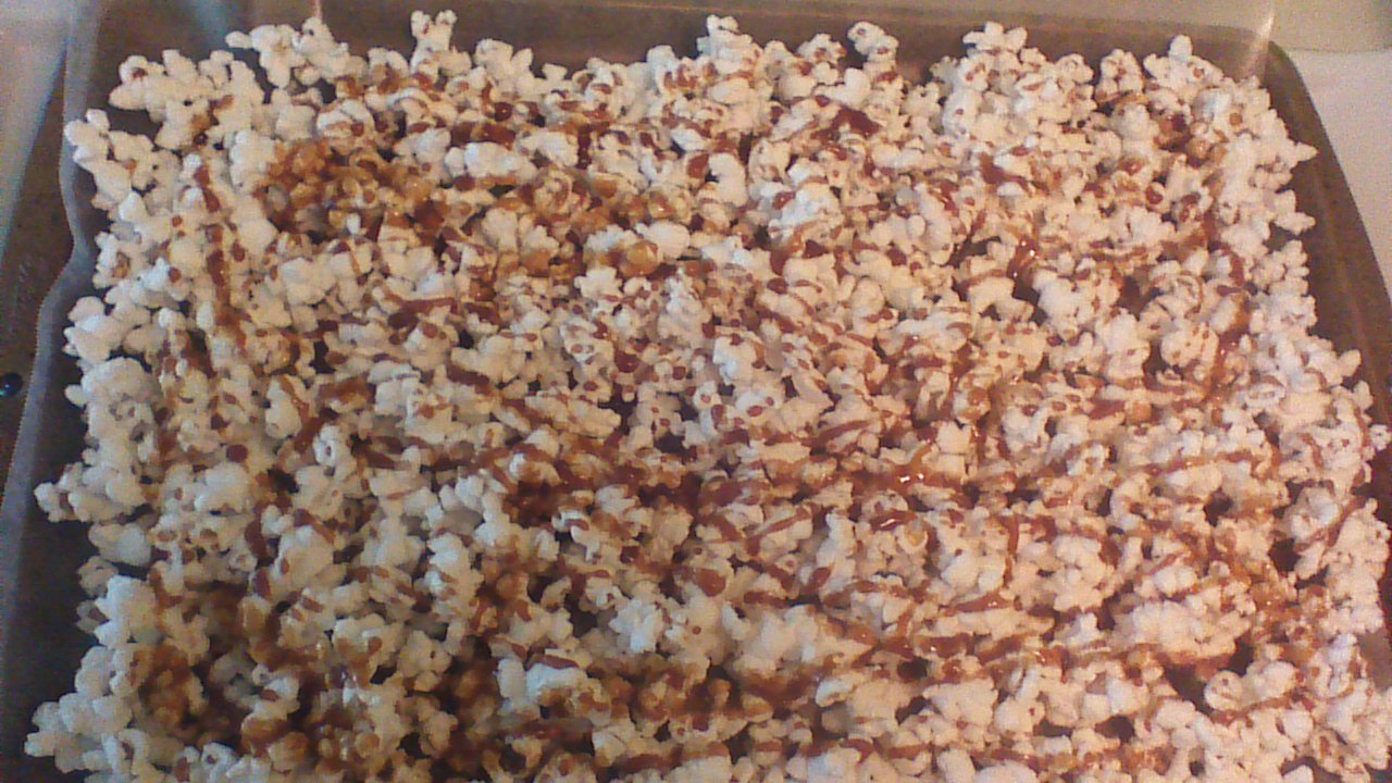WIN_20160528_161707Step 3) Spread popcorn on baking sheets lined with waxed paper. Carefully drizzle the caramel mixture over the popcorn. Use a metal spatula to gently lift the coated popcorn. This spreads the caramel onto more of the popcorn, and also helps to prevent sticking.