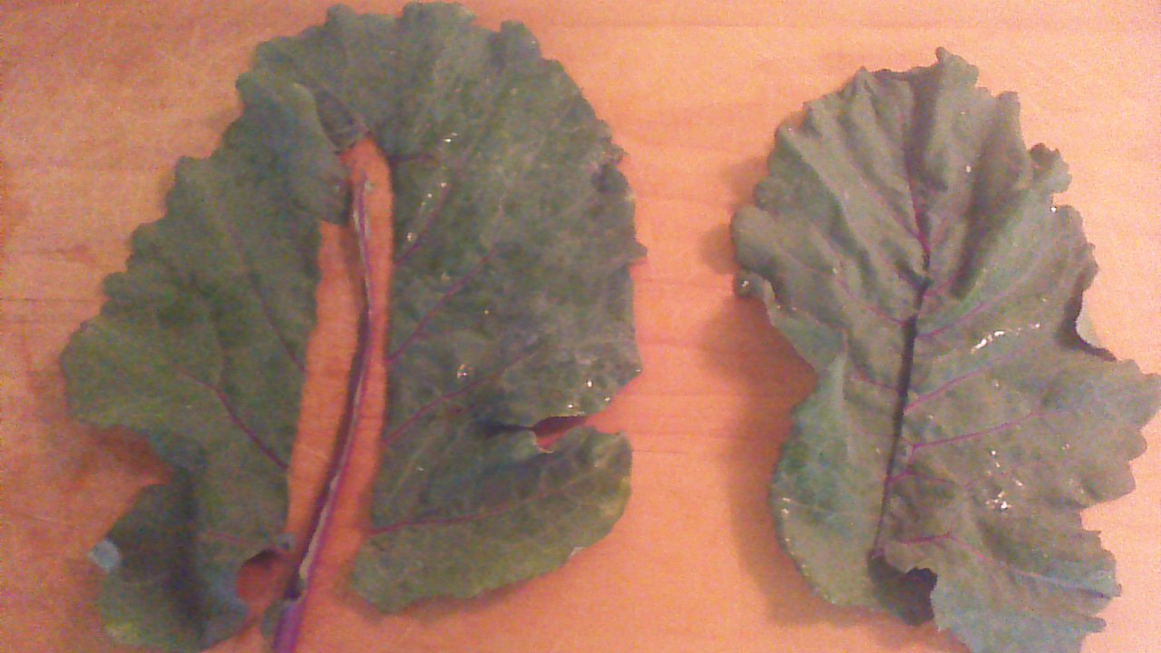 Step 2) While rice mixture is cooking, carefully cut the center stem (sometimes called a vein) from each kohlrabi leaf. Overlap the two sides so that each leaf forms an approximate oval shape without a visible hole in the middle.