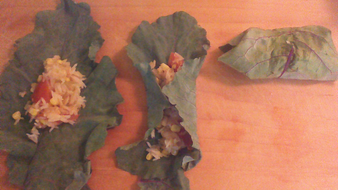 It’s kohlrabi season in my neck of the woods. As excited as I am to see farm stands re-opening for the summer season, the selection in early June is pretty limited. Kohlrabi, peas, more kohlrabi, more peas… you get the idea. It’s a shame so many cooks discard the leaves from their kohlrabi. The leaves are both nutritious and delicious! Today we’re using them a bit like cabbage leaves, and are using fresh kohlrabi leaves to roll up a hearty filling of seasoned rice, tomatoes, corn, and peppers. Feel free to add ground beef and/or top with grated cheese if you’d like.