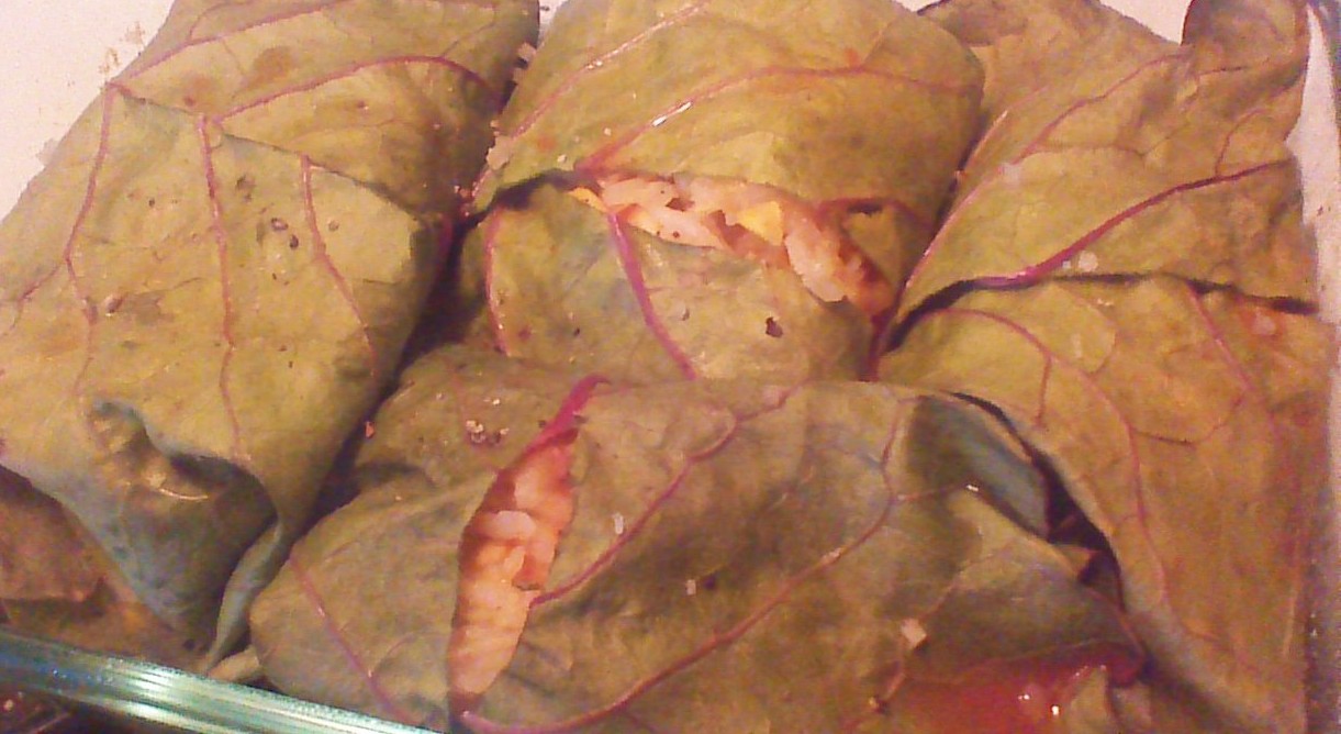 Step 3) Place a small amount of the rice mixture (about 2 tablespoons) on the center of each kohlrabi leaf. Fold the sides of the leaf in toward the middle (shown), then carefully roll up the leaf from the bottom. Place each kohlrabi roll-up seam side down in a lightly greased baking dish (I used two small baking dishes and froze one to enjoy later).