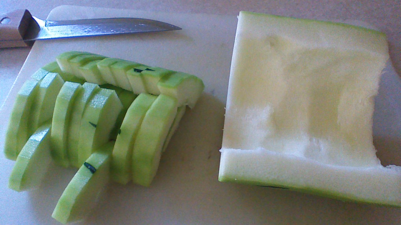 Step 1) Peel zucchini and remove 1/2 inch from each end. Slice peeled zucchini in half lengthwise and scoop out all of the seeds. The pulpy middle, which contains seeds, is a brighter white color than the outer flesh – scrape out all of the pulp with a spoon and add this to your compost pile. Slice the zucchini flesh into bite size pieces, approximately 1 inch long and 1/3 inch thick. You should have about 24 cups of zucchini pieces.
