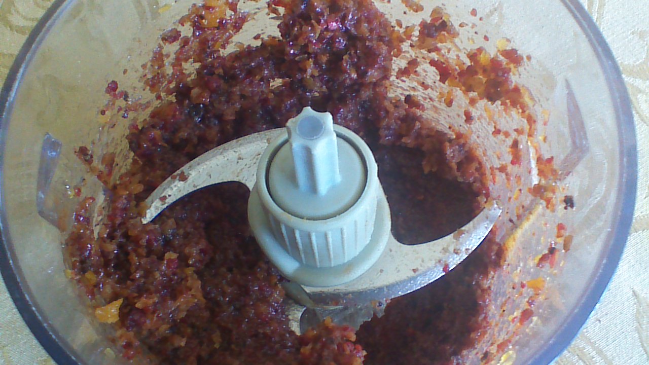 Step 1) Combine all dried fruit, nuts, and cardamom in a small blender or food processer and blend until smooth.