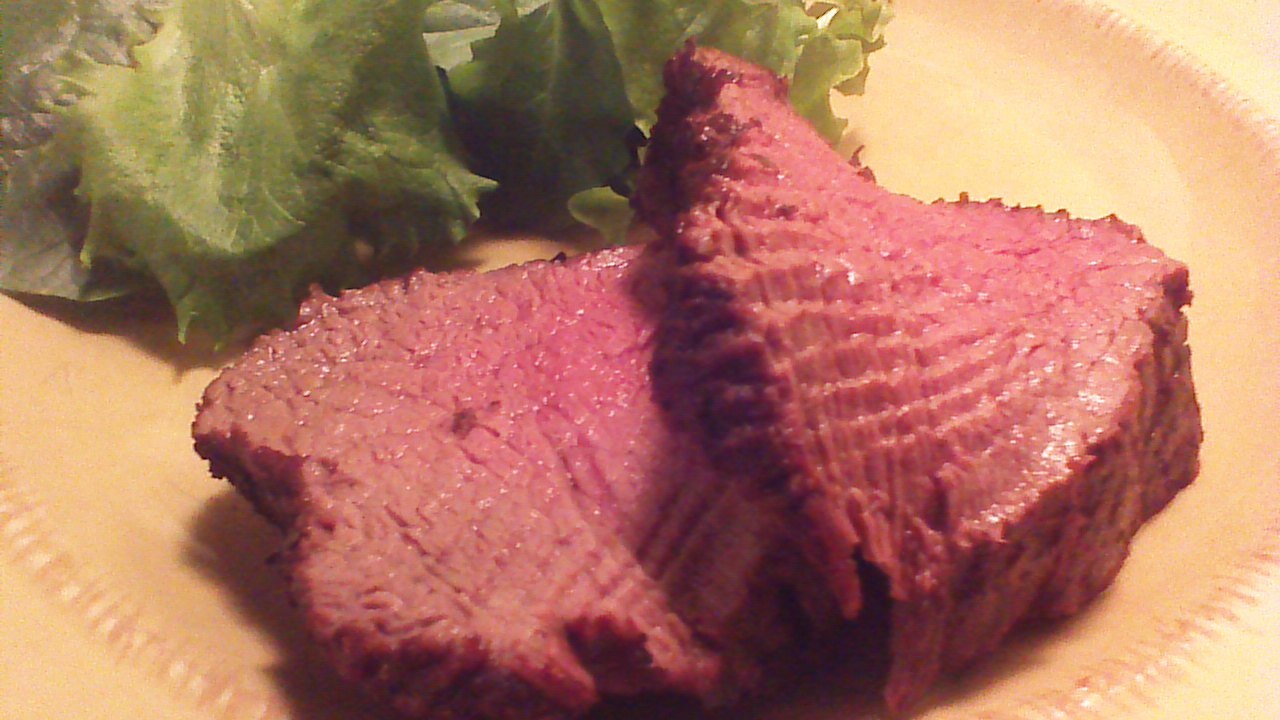 Step 4) After 5 minutes, cut tenderloin across the grain into 1 1/2 inch thick slices. Serve immediately with a green salad and the starch (potatoes, yams, or perhaps squash) of your choice.